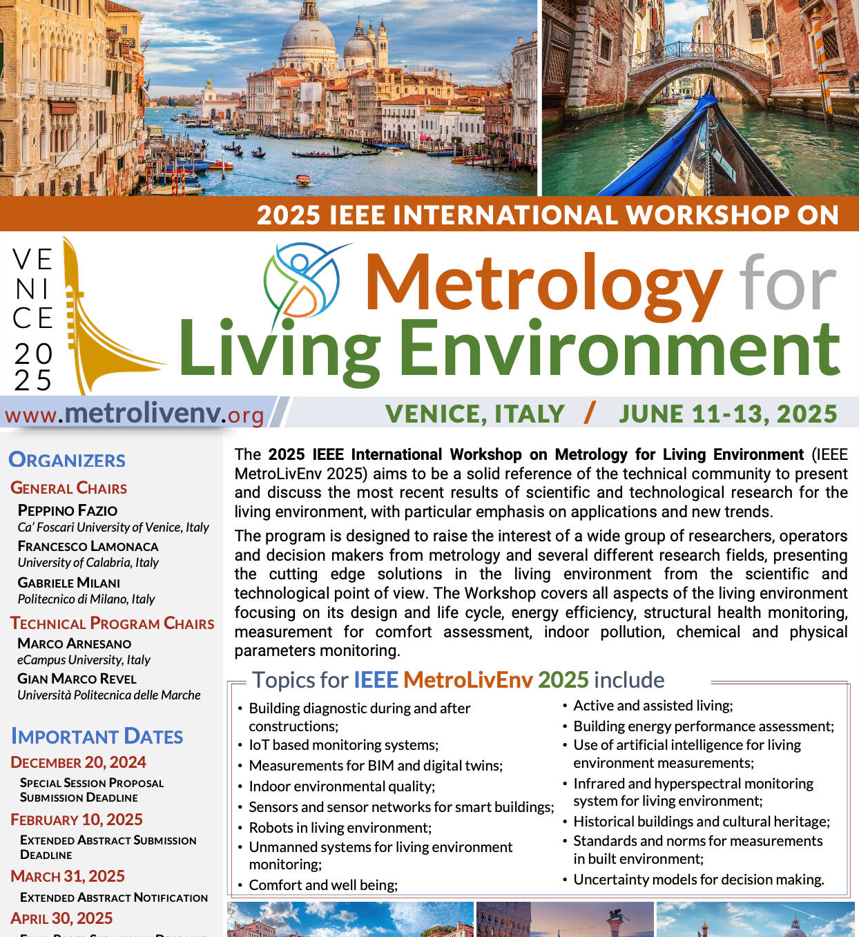 The program is designed to raise the interest of a wide group of researchers, operators and decision makers from metrology and several different research fields, presenting the cutting edge solutions in the living environment from the scientific and technological point of view. The Workshop covers all aspects of the living environment focusing on its design and life cycle, energy efficiency, structural health monitoring, measurement for comfort assessment, indoor pollution, chemical and physical parameters monitoring.