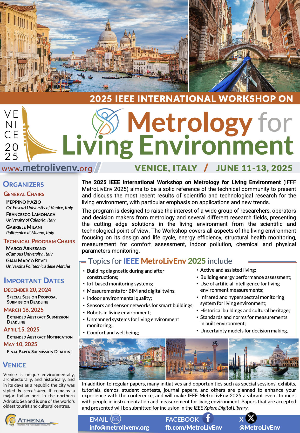The program is designed to raise the interest of a wide group of researchers, operators and decision makers from metrology and several different research fields, presenting the cutting edge solutions in the living environment from the scientific and technological point of view. The Workshop covers all aspects of the living environment focusing on its design and life cycle, energy efficiency, structural health monitoring, measurement for comfort assessment, indoor pollution, chemical and physical parameters monitoring.